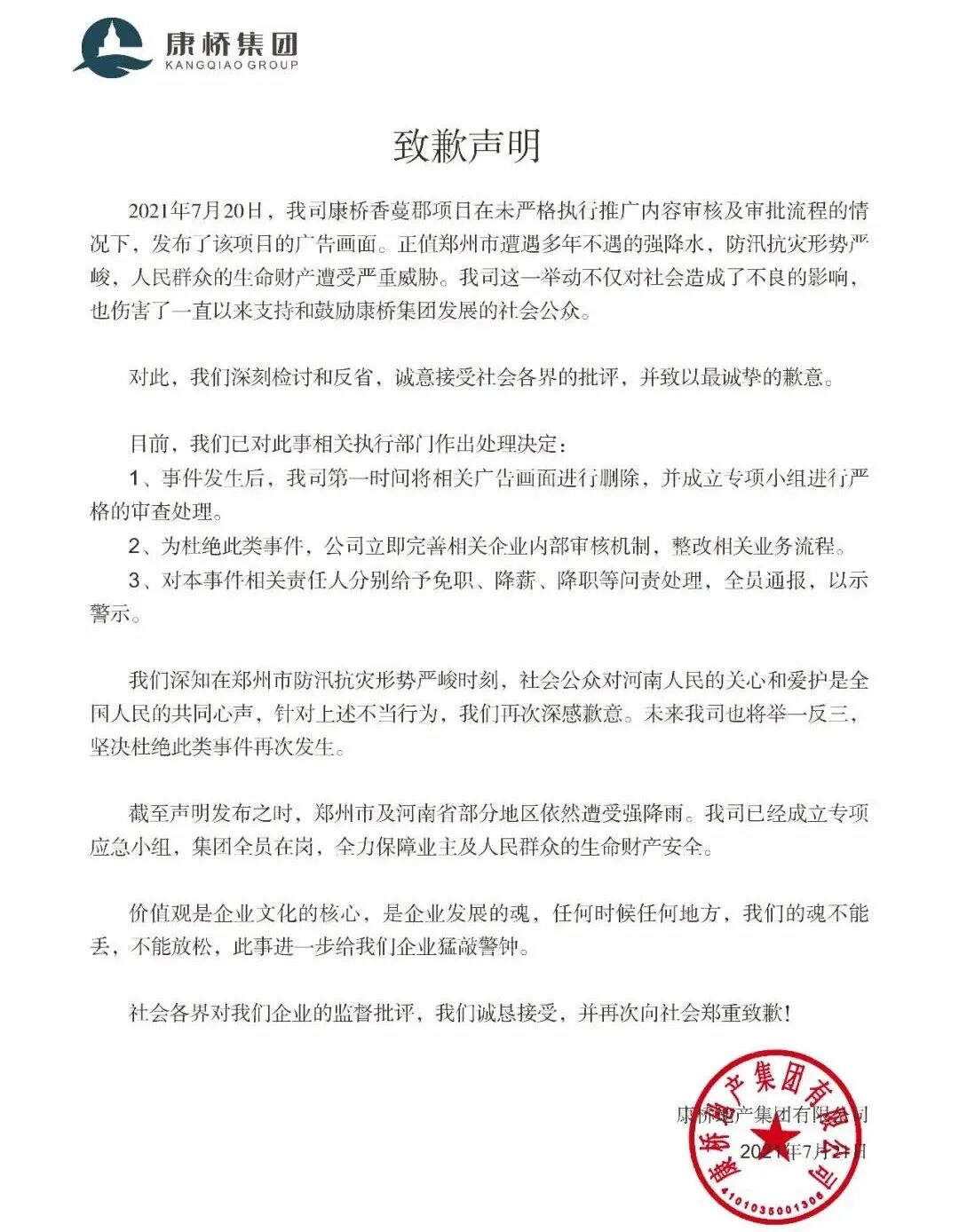 7月21日早间,康桥集团发布“致歉声明”称,已经第一时间将广告删除,并成立专项小组进行严格审查,对相关责任人予以免职、降薪、降职等问责处理。