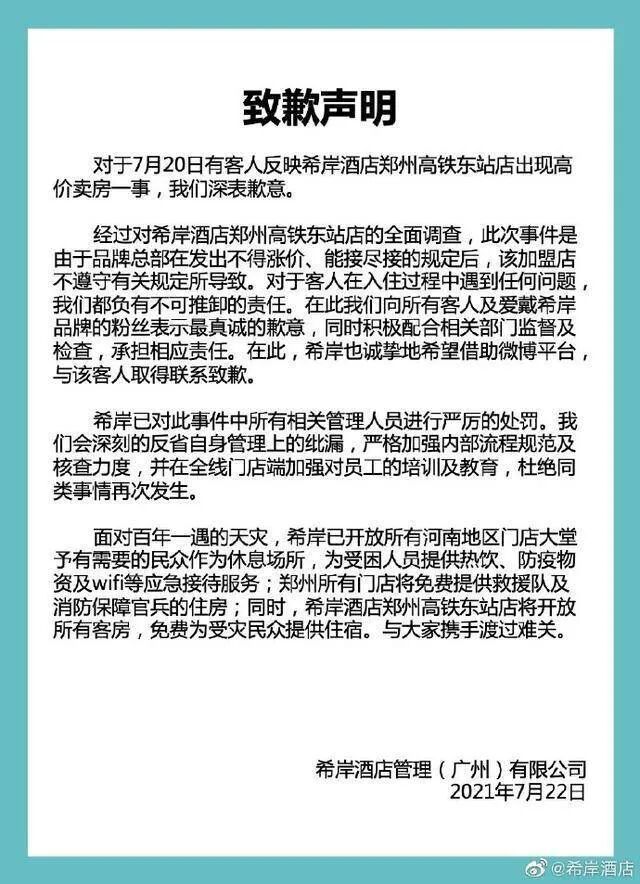 22日凌晨3点,希岸酒店发布致歉声明,对于7月20日有客人反映希岸酒店郑州高铁东站店出现高价卖房一事深表歉意。经调查,此次事件是由于品牌总部在发出不得涨价、能接尽接的规定后,该加盟店不遵守有关规定所导致,已对此事件中所有相关管理人员进行严厉的处罚。