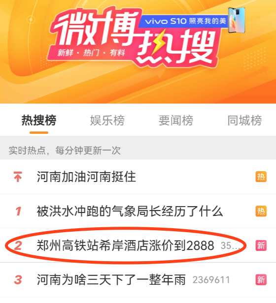 近日,河南郑州遭遇的强降雨天气,出行旅客通行受阻之际,郑州高铁站的一家酒店却借暴雨天气哄抬物价。7月21日消息,因暴雨滞留在郑州的旅客@艺梵梵梵发文称,20日晚高铁站希岸酒店涨价到近三千一晚。