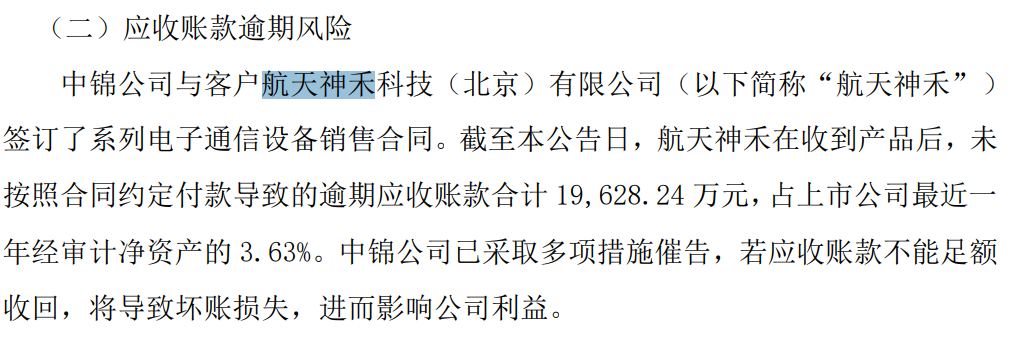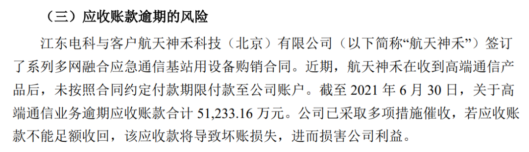 而中天科技踩雷的同样是航天神禾这家公司,其发布公告称,公司其下属经营高端通信业务的控股子公司江东电科与客户航天神禾签订了系列多网融合应急通信基站用设备购销合同。近期,航天神禾在收到高端通信产品后,未按照合同约定付款期限付款至公司账户。截至2021年6月30日,关于高端通信业务逾期应收账款合计5.12亿元。