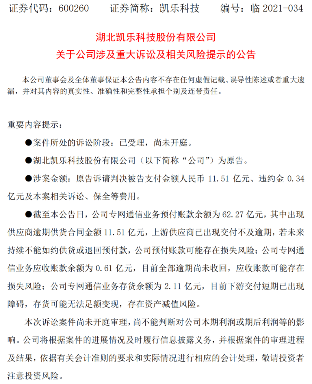 7月23日晚间,凯乐科技发布关于公司涉及重大诉讼及相关风险的公告。