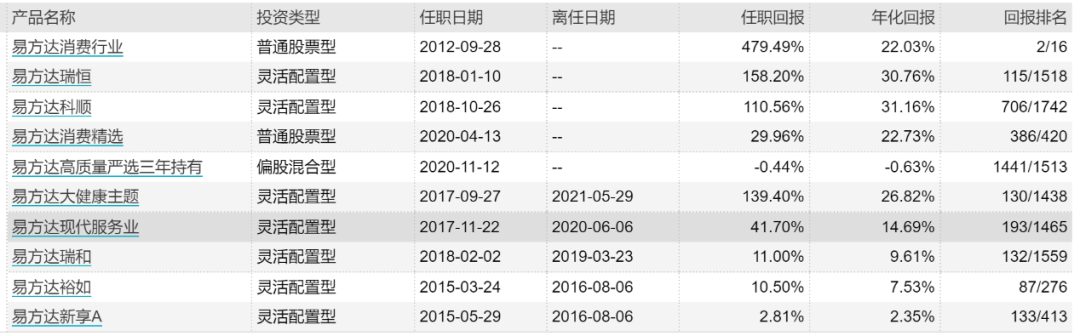 研究出身的萧楠尤其擅长大消费领域的投资,和张坤、刘彦春、王宗合并称为“消费四大天王”。以其管理规模最大、管理时间最长的易方达消费行业股票为例,据wind数据统计,萧楠自2012年9月28日开始管理该基金,截至2021年7月23日的任职回报为479.49%,年化回报22.03%。