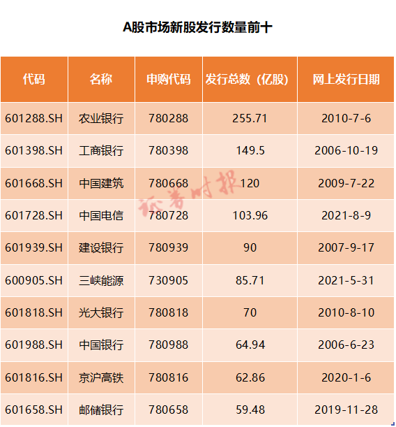 Wind 数据显示,A股有史以来新股发行数量最多的上市公司是农业银行,共发行近256亿股,工商银行次之,发行总数为150亿股,中国建筑紧随其后,共发行了120亿股的新股,而中国电信此次发行量位列第4名,发行数约为104亿股(超额配售选择权全额行使前)。同时,中国电信也是继农业银行以后,近11年以来新股发行数量最多的上市公司。