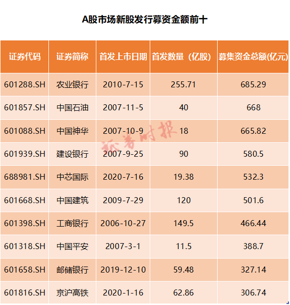 新股发行所募集的资金总额方面,农业银行募资额最高,为685亿元,中国石油、中国神华分别募资668亿元、666亿元,建设银行募资581亿元。如果按照中国电信此前披露的拟募资544亿计算,那么其排名第五。