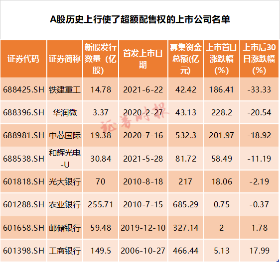 Wind 数据显示,A股历史上行使超额配售权的上市公司共有8家。仔细观察不难发现,其中有一半公司所属行业均为银行业,分别是光大银行、农业银行、邮储银行和工商银行。而另外半数公司的共同特点则是,均为科创板公司。