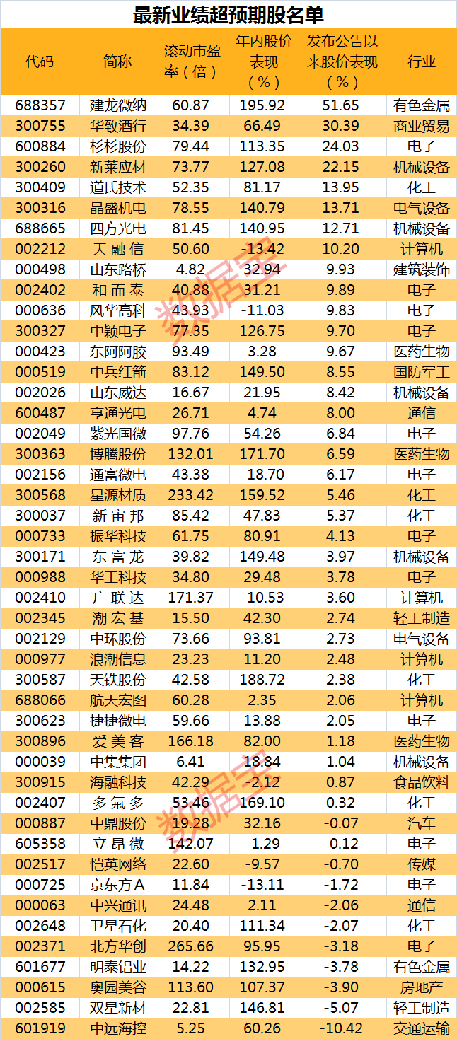 业绩超预期公司业绩多延续上半年的高增长业绩,多数公司股价表现较强,如建龙微纳、天铁股份、博腾股份、多氟多、星源材质和中兵红箭等16股年内涨幅翻倍。
