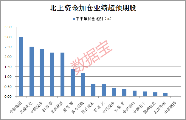 资金对业绩超预期股关注度较高。数据显示,业绩超预期公司中,北上资金下半年加仓中集集团、晶盛机电、中鼎股份、和而泰和星源材质等16股。其中,山东路桥、中集集团、中鼎股份、浪潮信息和中兴通讯的估值最低,滚动市盈率均不足30倍。