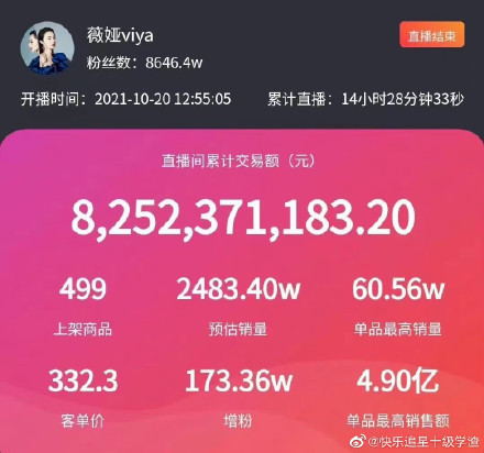 在10月20日下午开始的直播,12个半小时的时间里,李佳琦直播间成交额达106.5亿元。薇娅比李佳琦提前半小时开播,一天内的成交额也达82.5亿元。