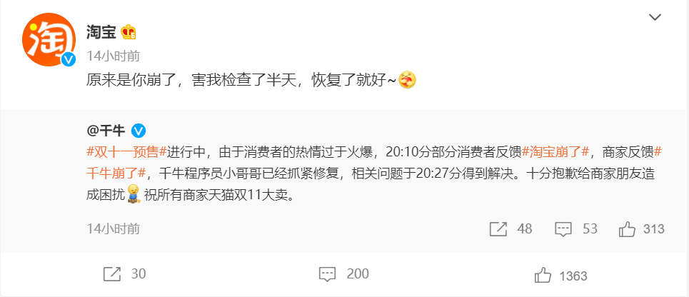 今天早上,“淘宝崩了”和淘宝的“双十一预售”双双登上热搜的第一和第二。