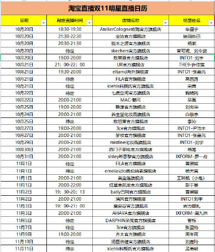 与预售一起开始的,还有一份淘宝直播双十一明星直播日历。