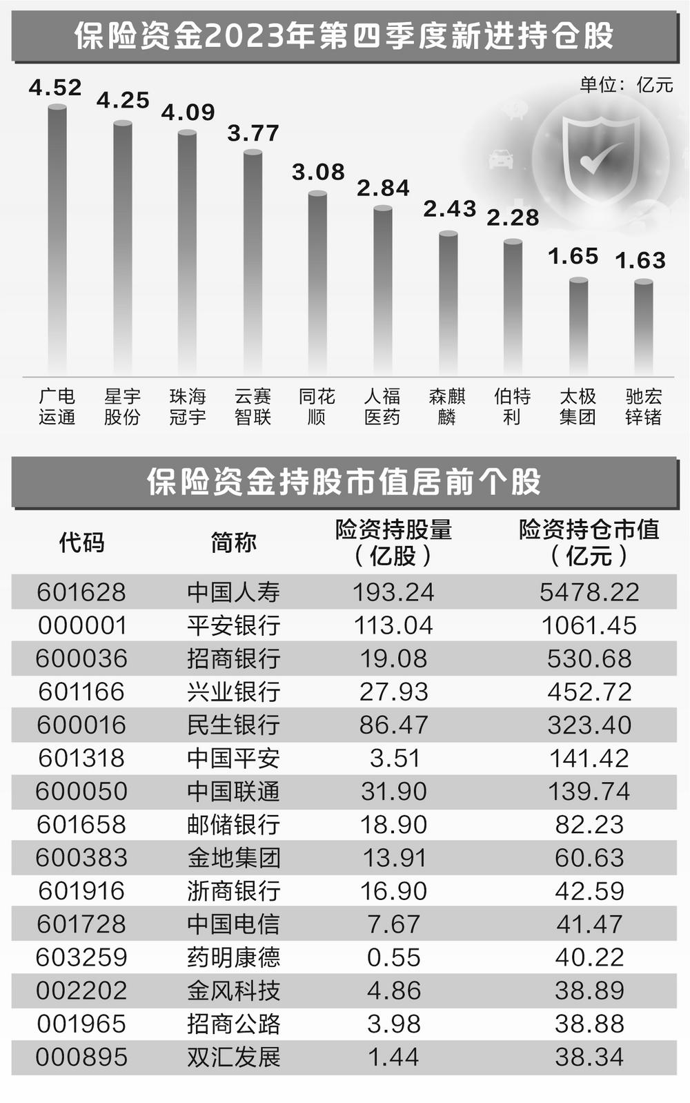 e公司讯,作为资本市场重要的专业机构投资者,保险资金(以下简称“险资”)的动向备受市场关注。随着上市公司2023年年报的陆续公布,险资最新持股动向也浮出水面。证券时报·数据宝统计,截至最新,险资合计现身250只股票的前十大流通股东榜单,合计持仓市值达到9236亿元,其中47只股票为险资新进重仓股。