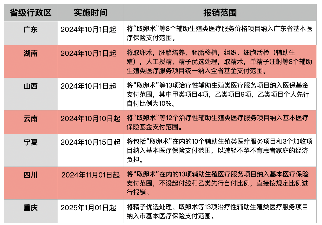 e公司讯,10月份以来,“扩大辅助生殖技术服务资源”成为各地重要抓手。证券时报·e公司记者统计,截至10月28日,本月已有广东、湖南、山西、云南、宁夏、四川、重庆等省级行政区公布辅助生殖纳入医保最新进展。其中,10月1日起,广东、湖南、山西正式将“取卵术”等相关辅助生殖类医疗服务项目统一纳入医保范围;10月15日起,宁夏将包括“取卵术”在内的10个辅助生殖类医疗服务项目和3个加收项目纳入基本医疗保险支付范围;11月份起,四川13项辅助生殖类医疗服务项目将正式纳入医保;而重庆明年1月1日起13项辅助生殖项目将纳入医保。有机构认为,随着多个省份和直辖市跟进,预示着辅助生殖需求有望快速释放,产业链发展有望提速。