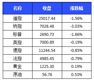 美股周一集体下挫,截至收盘,道指下跌395.78点,或1.56%报25017.44点;标普500指数跌45.54点,或1.66%报2690.73点;纳指大跌219.39点,或3.03%报7028.48点。