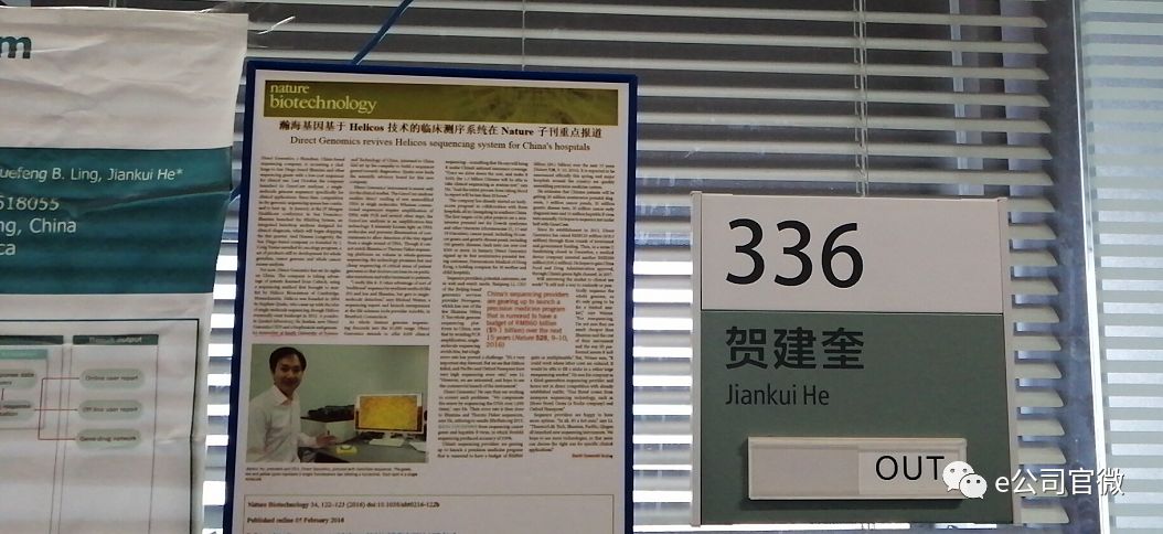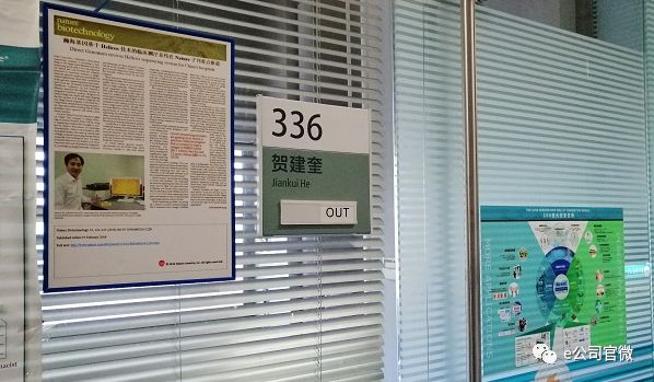 下午4点半左右,e公司记者来到南方科技大学第一科研楼,找到了贺建奎副教授的办公室。该办公室已经上锁,门口还贴着瀚海基因(贺建奎系瀚海基因的法定代表人)一项技术的“临床测序系统在Nature子刊重点报道”的宣传海报。该办公室旁边就是南方科技大学生物系实验室。实验室工作人员表示,贺建奎最近不在办公室,他也很少在这里做实验,“他在外面应该有自己的实验室。”