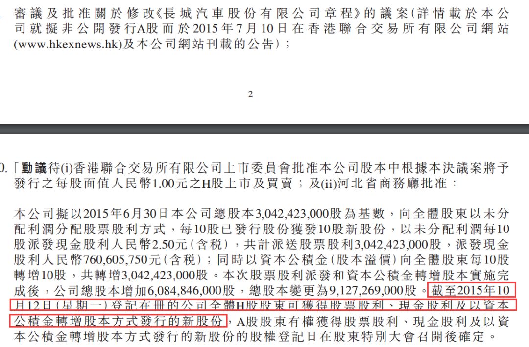 长城汽车在2015年8月28日公布其发行红股的建议,数量相等于其当时已发行股份的200%,而有关红股发行须待某些条件达成后方可实施。有关红股的交收日期预计为2015年10月13日。