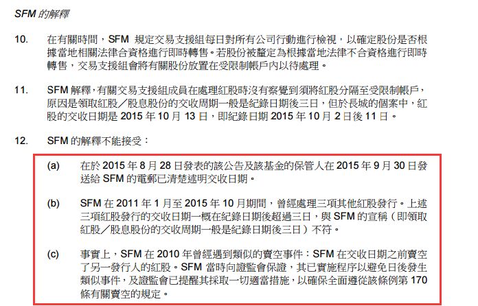 二是因为,SFM在2011年1月至2015年10月期间,曾经处理三项其他红股发行。上述三项红股发行的交收日期一概在纪录日期后超过3日,与SFM的宣称(即领取红股/股息股份的交收周期一般是纪录日期后3日)不符。
