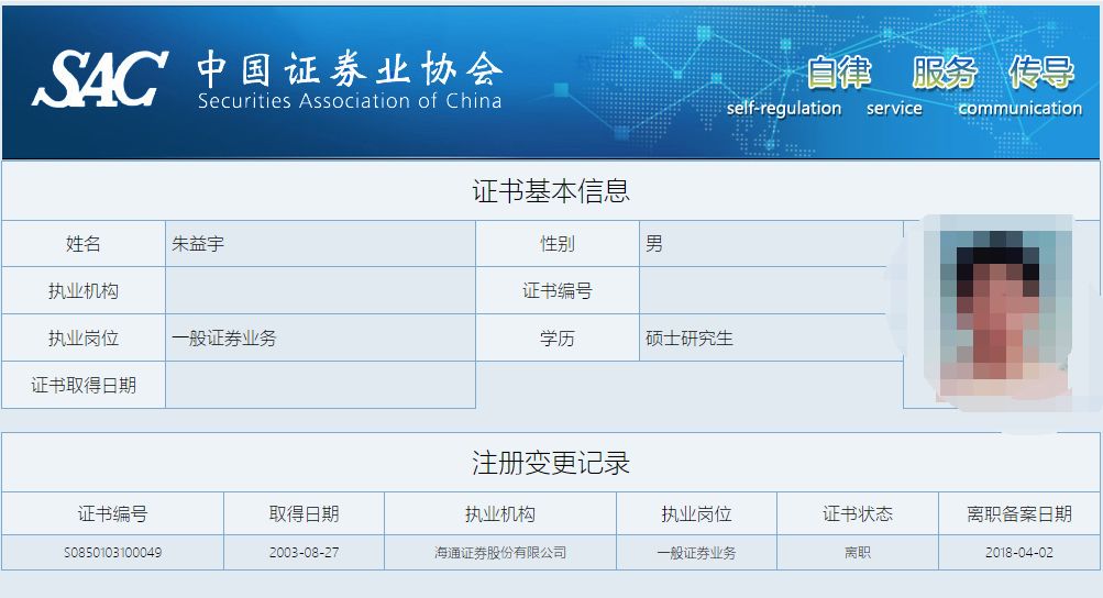 公开资料显示,本次案件的主角朱益宇是海通证券前员工。2001年7月,朱益宇入职海通证券,2003年8月27日取得中国证券业执业证书。此后至2018年3月26日一直在海通证券工作。