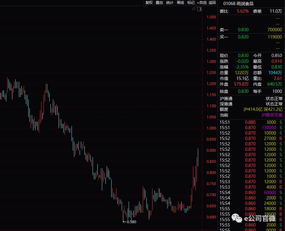 雨润食品还有一个最大的特点,便是遍布全国的生产加工基地,公司也借此与众多农户拉近距离,并得到地方政府的大力支持。也正因如此,雨润食品巅峰时期的市值达到680亿港元。然而,受多重因素影响,雨润食品当前市值仅剩15亿港元。这还是在近期有所反弹的情况下,祝义财回归的消息明显刺激到了股价。