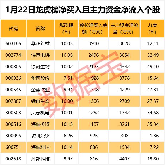 1月22日龙虎榜中机构及营业部席位资金净卖出0.47亿元,其中净买入的个股有12只;净卖出的个股有12只。净买入前三名个股分别是华正新材、快意电梯、银河生物,净买入金额占当日成交额比例达13.05%、22.20%、24.01%。