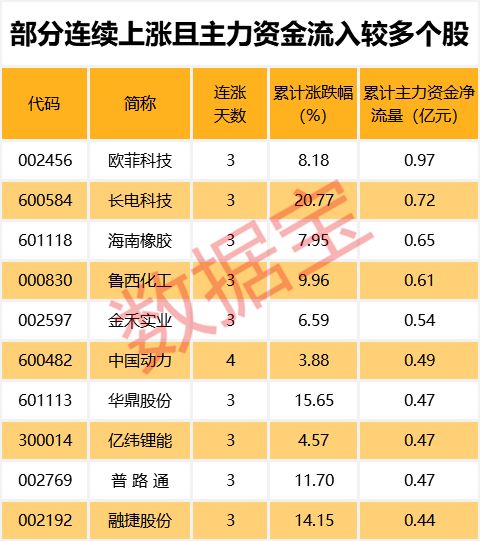 值得注意的是,229只连续上涨个股中,5只个股期间主力资金累计净流入超过5000万元。其中,累计资金流入最多的为欧菲科技,主力资金累计流入0.97亿元。