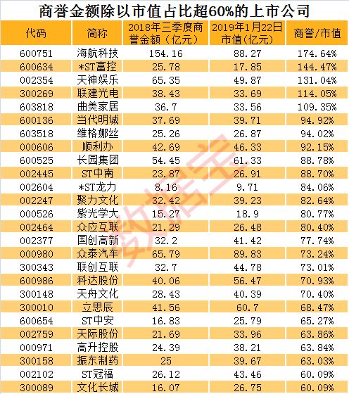 虽然商誉规模除以这些上市公司市值之和,占比仅为4.32%,但商誉金额除以2017年这些上市公司净利润后,占比达66.94%。如此巨大商誉规模,未来的减值在所难免。投资者对上市公司存在的商誉应该保持高度警惕,尤其是那些商誉规模大或者商誉规模占市值比例大的公司。数据宝统计显示,不乏商誉规模占上市公司市值超60%的上市公司。