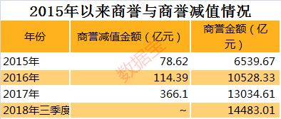 数据宝统计,2015年至2017年商誉减值金额呈现上升趋势,2017年相对2015年商誉减值金额增加3.66倍。2015年至2018年三季度报,商誉总额增长超1.21倍。