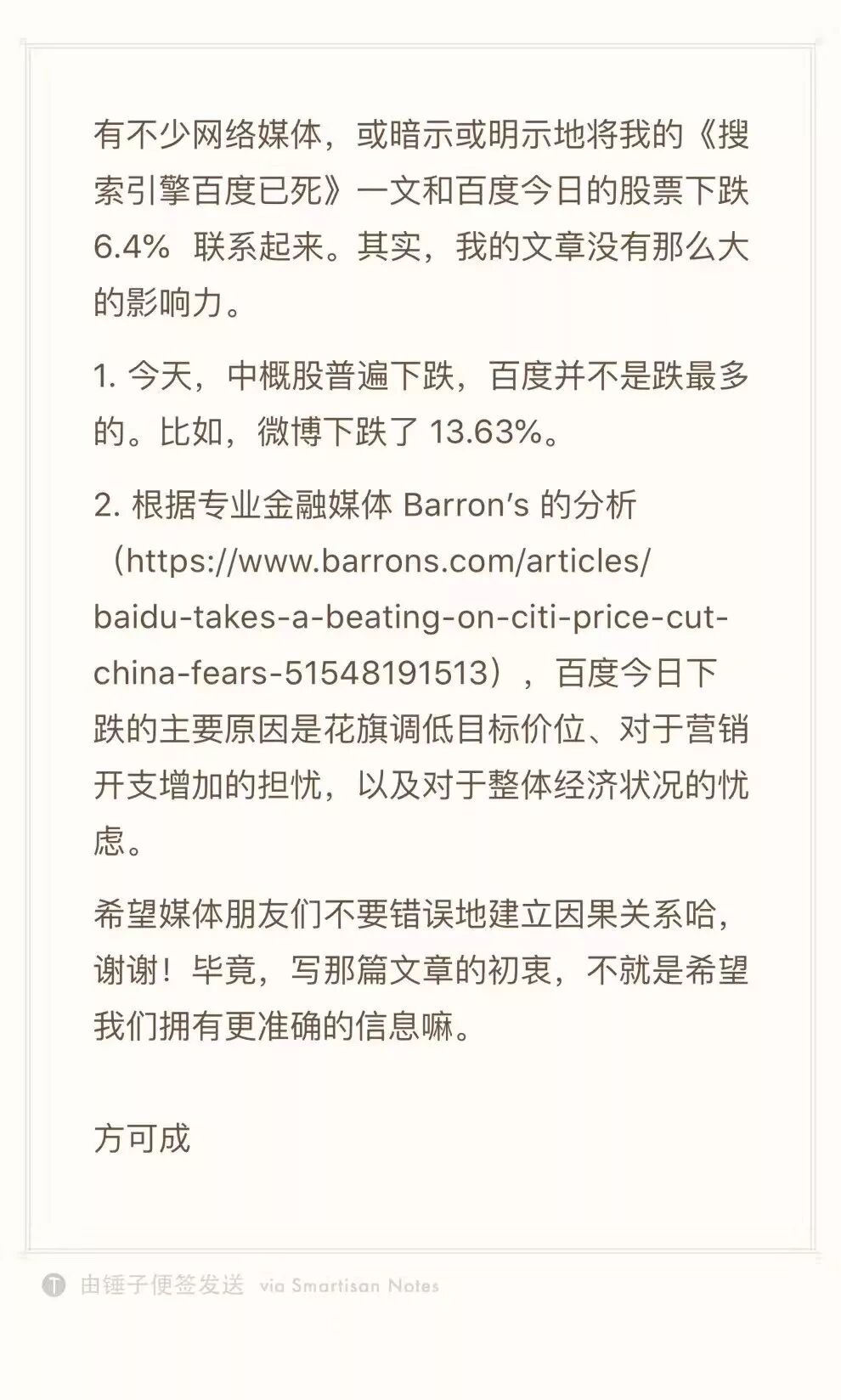 声明称,有不少网络媒体,或暗示或明示地将《搜索引擎百度已死》一文和百度今日的股票下跌6.4%联系起来。其实,我的文章没有那么大的影响力。