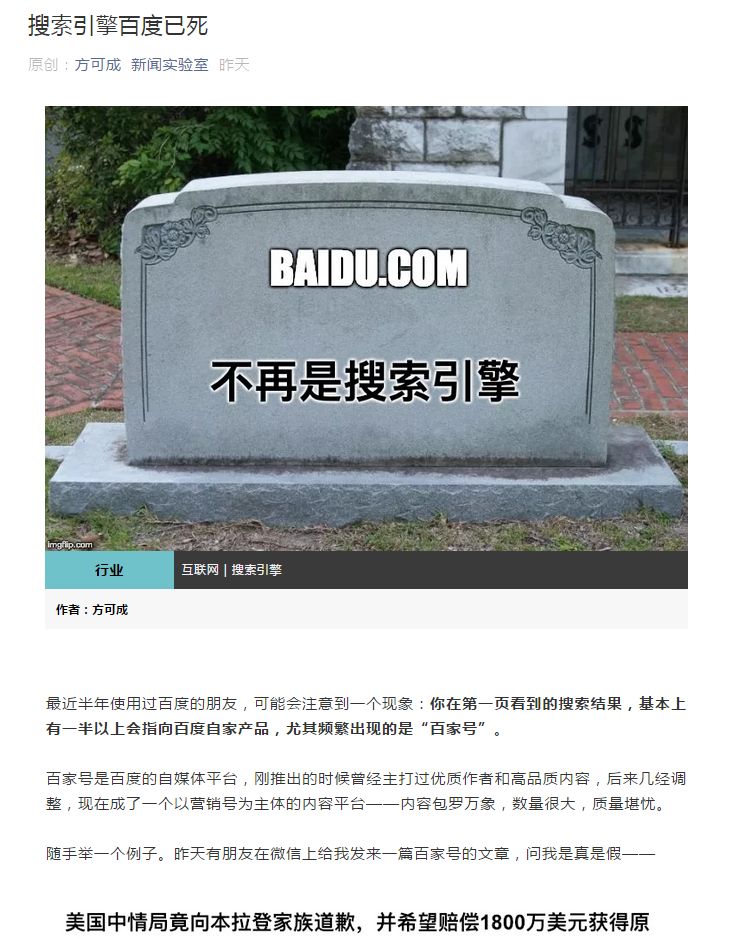 昨晚,一篇由自媒体“新闻实验室”发布的《搜索引擎百度已死》的文章刷屏。文章指责百度搜索结果一半以上会指向百度自家产品,尤其是百家号。而百家号充斥着大量营销和质量低劣的内容,导致百度搜索结果的内容质量大幅下滑。