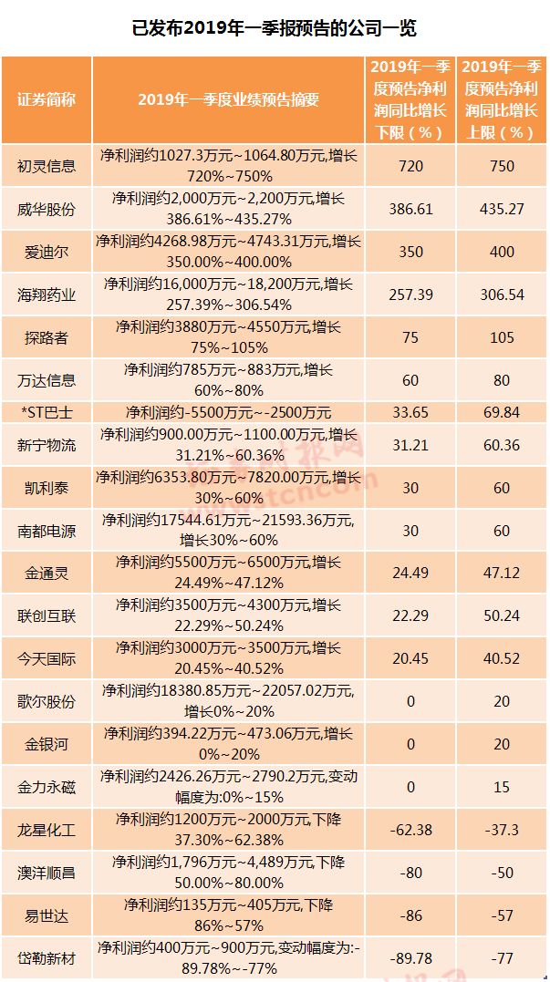 另外,截至发稿,已有20家公司对2019年一季度业绩作出预测,总体以预喜为主。按照业绩预计同比增长下限计算,初灵信息、威华股份、爱迪尔、海翔药业预计一季度净利润同比增速均超过100%。