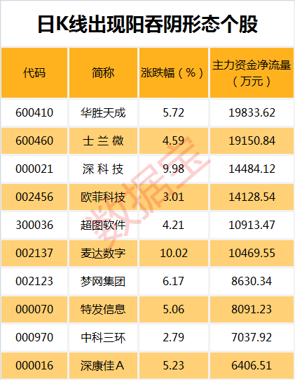 目前两市共有95只个股日K线出现阳吞阴形态,当天涨幅最大的是和胜股份、麦达数字、紫光学大,涨幅分别为10.03%、10.02%、9.99%。