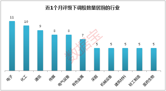 下调评级111股共分布于25个申万行业,其中11个行业下调评级股数量超过5只。电子、化工行业股数量最多,各有11只、10只,通信行业9只,传媒及电气设备各有8只。另外,商业贸易、家用电器及非银金融各有1只,分别是芒果超媒、美的集团及中信建投。值得一提的是,美的集团2018年度净利润增幅中值17.5%,2017年为17.7%,该公司2018年度净利润增速很可能出现下滑。