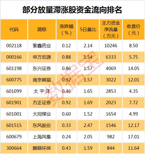 值得注意的是,40只放量滞涨股中,紫鑫药业、申万宏源、东兴证券、南京熊猫、太平洋等个股主力资金净流入较多。