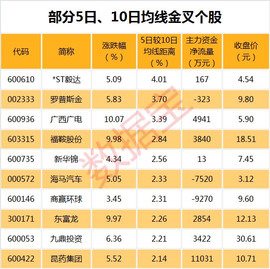 从个股形态来看,有511只A股的5日均线主动上穿10日均线,其中*ST毅达、罗普斯金、广西广电等个股的5日均线较10日均线距离最大,分别达4.01%、3.70%、3.39%。