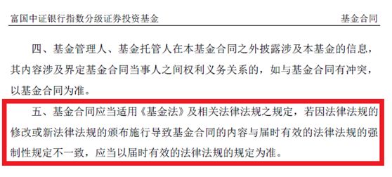 基金君从基金合同的前言部分查到这一条款:“基金合同应当适用《基金法》及相关法律法规之规定,若因法律法规的修改或新法律法规的颁布施行导致基金合同的内容与届时有效的法律法规的强制性规定不一致,应当以届时有效的法律法规的规定为准”