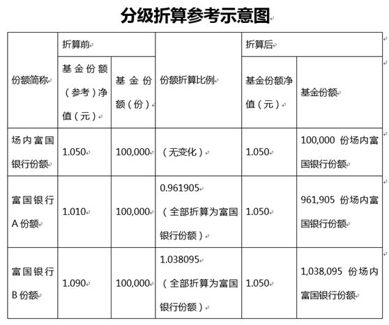 举例来说,假设份额折算基准日富国银行份额、富国银行A份额和富国银行B份额的基金份额(参考)净值的分别为:1.050元、1.010元、1.09元,投资者甲、乙、丙分别持有场内富国银行份额、富国银行A份额、富国银行B份额各100,000份,其所持基金份额的变化如下表所示: