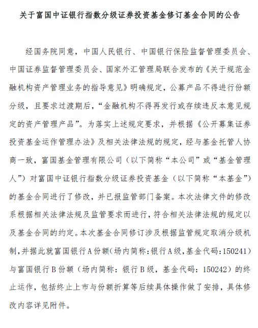 3月22日晚间,富国基金发布《关于富国中证银行指数分级证券投资基金修订基金合同的公告》。该公告显示,富国中证银行分级基金将取消分级机制,并就富国银行A份额与富国银行B份额的终止运作,包括终止上市与份额折算等后续具体操作做了安排。