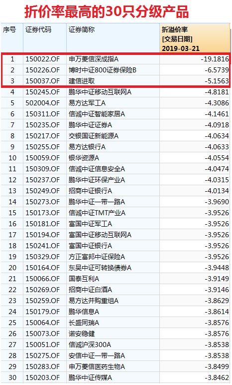 这类新的模式出现后,高折价的分级份额投资机会凸显,基金君快速统计出截至3月21日收盘折价率最高的30只分级产品。