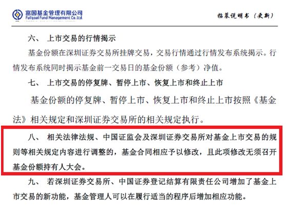 第八条规定了“相关法律法规、中国证监会及深圳证券交易所对基金上市交易的规则等相关规定内容进行调整的,基金合同相应予以修改,且此项修改无须召开基金份额持有人大会。”
