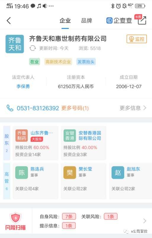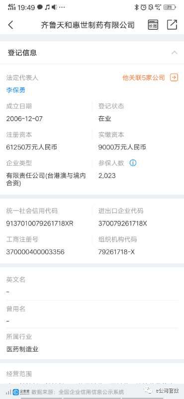企查查资料显示,天和惠世是山东制药龙头齐鲁制药旗下的子公司,成立于2006年12月7日,注册资本超过6亿元,法定代表人为李保勇,实际控制人为李燕,占股26.8%。其大股东为山东齐鲁制药集团有限公司,占股60%,另一位股东为安替香港国际有限公司,占股40%。