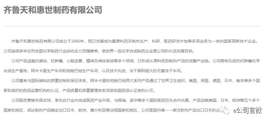据齐鲁制药官网资料,天和惠世集原料药及制药生产、科研、医药研发外包等多项业务为一体,连续多年位列全国化学制药行业综合实力百强榜单,累计投资10多亿人民币。