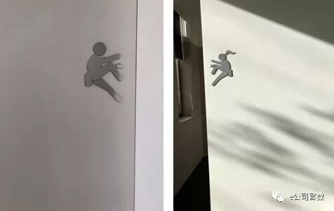 有创意基因的公司不喜欢将任何元素做得雷同。能认出这幅别致的卫生间标识吗?男似攀爬,女似跳跃,两者均腾空而起,相比于通常所见的男女站立标识,更有动感、更为灵性、更让人乐于光顾。