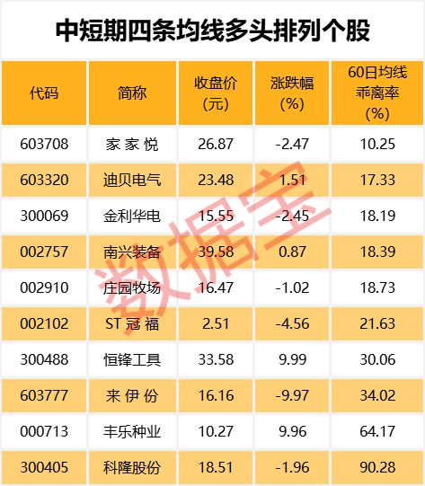 截至5月9日,10只个股5日、10日、20日、60日四条均线近日呈多头排列。其中家家悦、迪贝电气、金利华电股价与60日均线的乖离率最小,分别为10.25%、17.33%、18.19%。