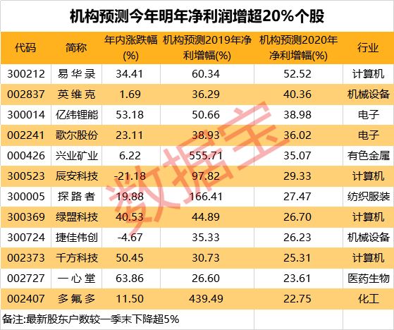 股东户数降超5%的103股中,机构预测12股2019年、2020年的净利润增幅超20%。