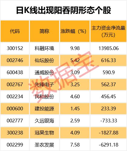 截至5月9日收盘,两市共有9只个股日K线出现阳吞阴形态,当天涨幅最大的是科融环境、圣农发展、仙坛股份,涨幅分别为9.98%、7.58%、5.42%。