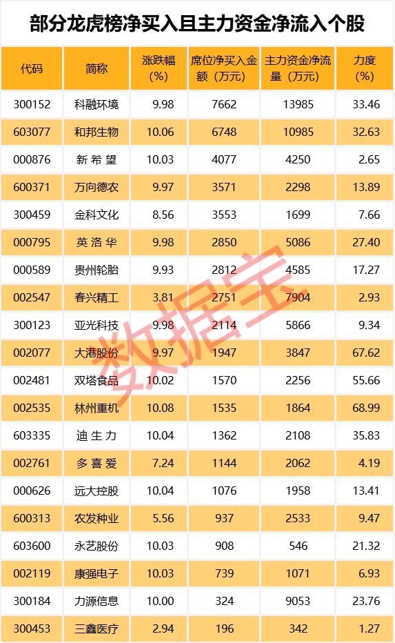 5月9日龙虎榜中机构及营业部席位资金净买入1.03亿元,其中净买入的个股有26只;净卖出的个股有23只。净买入前三名个股分别是科融环境、和邦生物、丰乐种业,净买入金额占当日成交额比例达18.33%、20.04%、7.39%。
