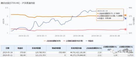 另外,腾讯控股连续获三个交易日净买入,截至5月15日收盘公司股价微涨收于374港元/股,近期南下资金缓慢加仓,最新持股比例升至2.1%。
