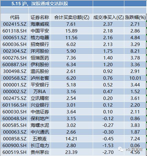 从成交活跃股来看,北上资金在反弹行情中的抢筹力度并不大,5月15日海康威视继续登榜净买入之首,金额约2.38亿元;其次是中国平安,招商银行、平安银行等也获加仓。其中,北上资金对白酒板块态度分化,龙头股贵州茅台以及五粮液遭持续净卖出,洋河股份、泸州老窖获净买入;另外创业板也获加码,温氏股份获净买入7597万元。