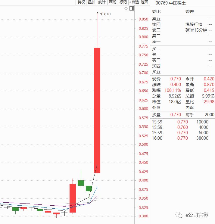 这一段时间A股众多稀土永磁概念股大涨,可都比不得港股中国稀土(00769)来得猛,在香港恒指冲高回落跌0.5%三连阴的情况下,中国稀土今日大涨108%,盘中一度大涨130%。