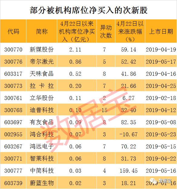以机构买入情况来评定一只次新股是否有料,不失为一个较好的办法。数据宝统计显示,4月22日以来龙虎榜机构净买入的个股中,有12股为今年以来上市次新股。净买入金额最高的是新媒股份,机构净买入超过2.1亿元。此外,帝尔激光、天味食品等个股机构净买入金额均超过5千万元,拉卡拉、立华股份等个股构净买入金额均超过千万元。