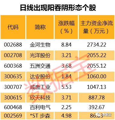 最新数据显示,两市共有11只个股日K线出现阳吞阴形态,当天涨幅最大的是金河生物、威唐工业、*ST步森,涨幅分别为8.84%、5.53%、4.98%。